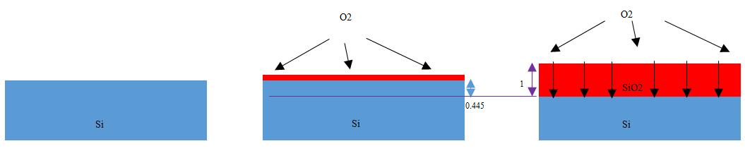 氧化工藝是在高溫下,襯底的硅直接與O2發(fā)生反應(yīng)生成SiO2,后續(xù)O2通過SiO2層擴(kuò)散到Si/SiO2界面,繼續(xù)與Si發(fā)生反應(yīng)增加SiO2薄膜的厚度,生成1個(gè)單位厚度的SiO2薄膜,需要消耗0.445單位厚度的Si襯底;