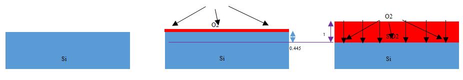 微納加工氧化工藝是在高溫下,襯底的硅直接與O2發(fā)生反應生成SiO2,后續(xù)O2通過SiO2層擴散到Si/SiO2界面,繼續(xù)與Si發(fā)生反應增加SiO2薄膜的厚度,生成1個單位厚度的SiO2薄膜,需要消耗0.445單位厚度的Si襯底;