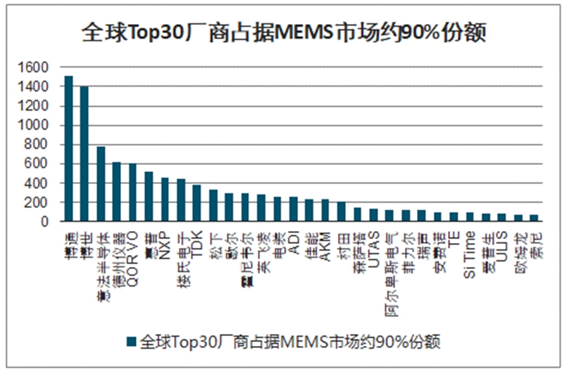 然MEMS產(chǎn)品的總體市場(chǎng)很大,但是由于產(chǎn)品的應(yīng)用領(lǐng)域極其廣泛以及工藝的不統(tǒng)一,各個(gè)細(xì)分市場(chǎng)的規(guī)模很小。每家公司即使占據(jù)1到2個(gè)產(chǎn)品線的領(lǐng)先地位,一般最多只能做到幾億美元的規(guī)模。例如,TI占據(jù)DLP市場(chǎng),惠普占據(jù)打印機(jī)噴墨頭市場(chǎng),安華高科技占據(jù)濾波器市場(chǎng),ADI、ST、飛思卡爾和美新占據(jù)加速度計(jì)市場(chǎng),樓氏占據(jù)麥克風(fēng)市場(chǎng),這些企業(yè)在單個(gè)市場(chǎng)占據(jù)很大的市場(chǎng)份額